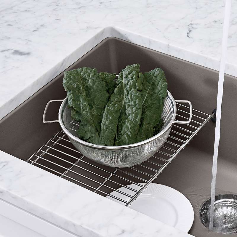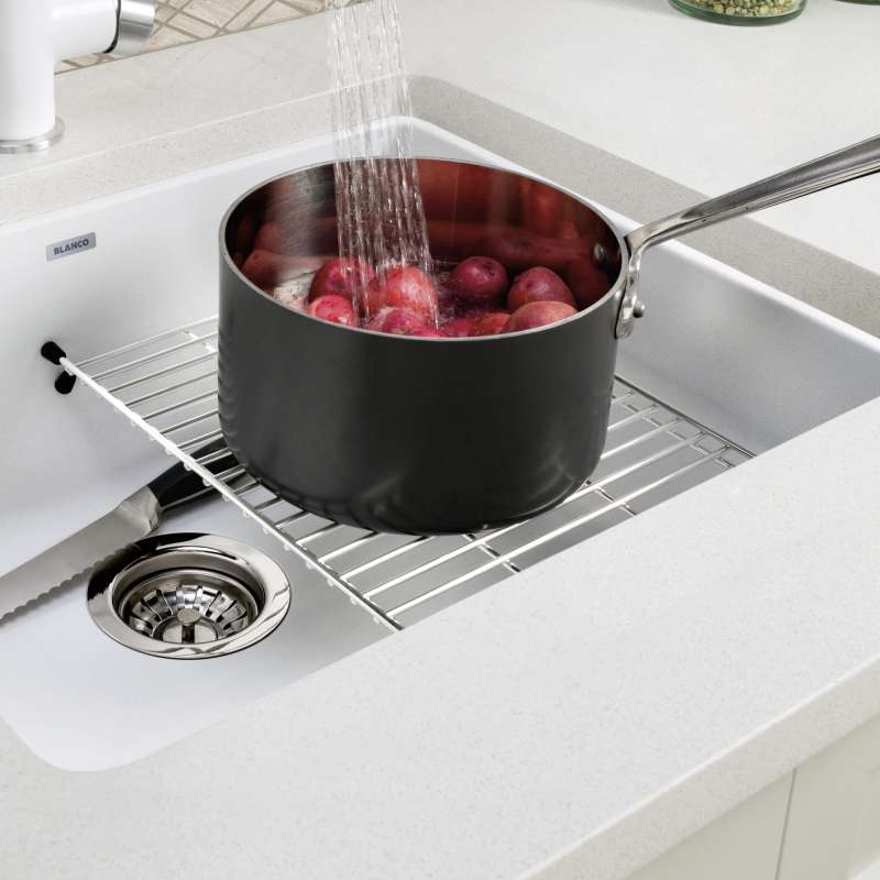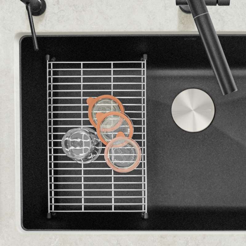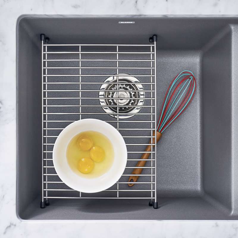 The BLANCO PRECIS FLOATING SINK GRID is a patented design which gently floats 5" above the sink bottom, and can be used as a second sink level for cleaning and prepping. It is strong enough to hold the weight of heavy pots and pans, making using your BLANCO sink that much easier. The grid can also be used as a countertop trivet for hot pots and pans. Add functionality and beauty to your kitchen with our high-quality floating grids.