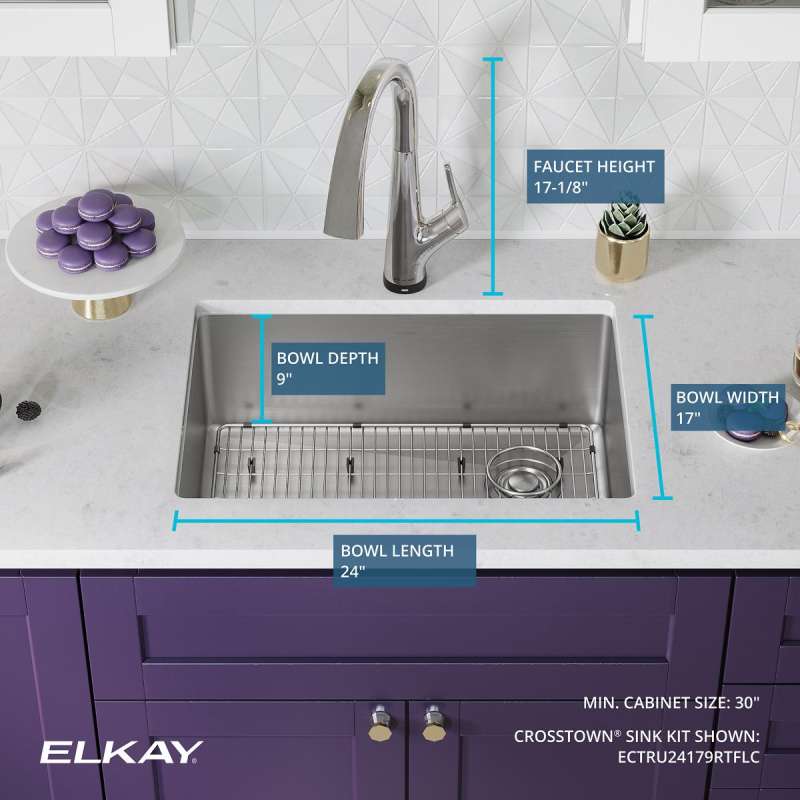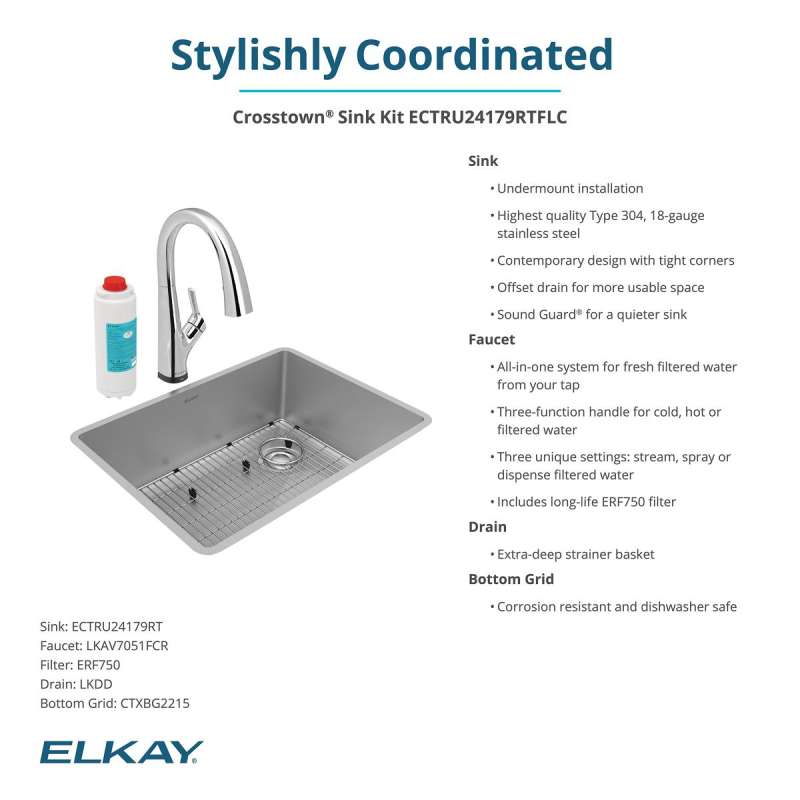 - KIT INCLUDES: ECTRU24179RT sink, LKAV7051FCR faucet with filter included, CTXBG2215 bottom grid, LKDD deep strainer drain; conveniently packaged together to save you time