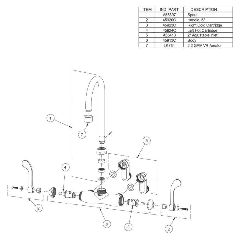 Foodservice 3-8" Adjustable Centers Wall Mount Faucet With 4" Gooseneck Spout 6" Wristblade Handles 2" Inlet, LK945GN04T6T