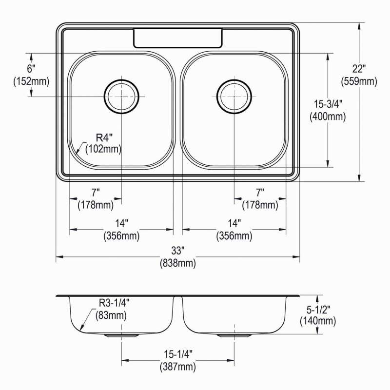 | Countertop Cutout Dimensions | 32-3/8" x 21-3/8" (822mm x 543mm) with 1-1/2" (38mm) corner radius |