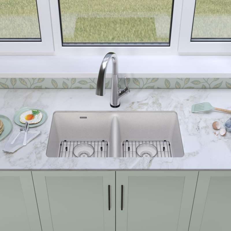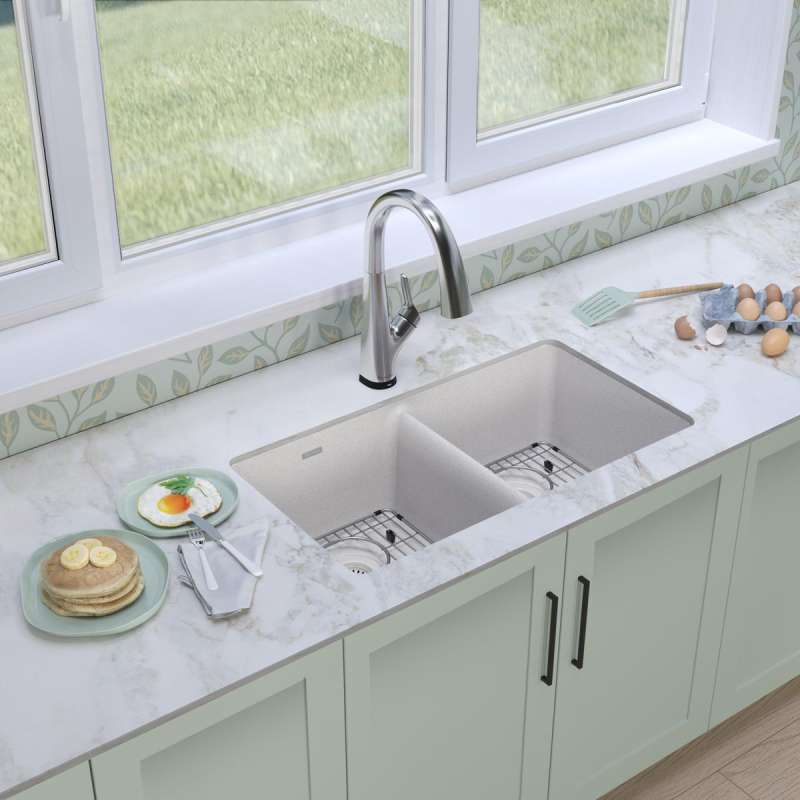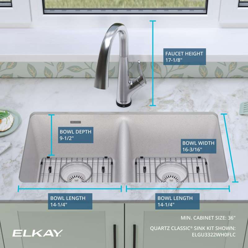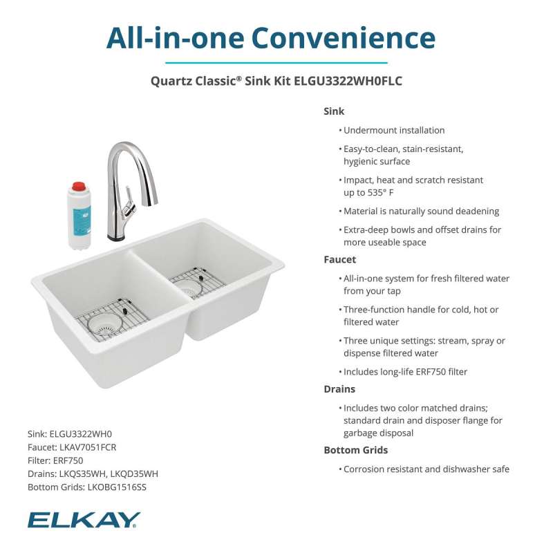 • KIT INCLUDES: ELGU3322WH0 sink, LKAV7051FCR faucet with filter included, two LKOBG1516SS bottom grids, LKQD35WH drain, LKQS35WH drain; conveniently packaged together to save you time