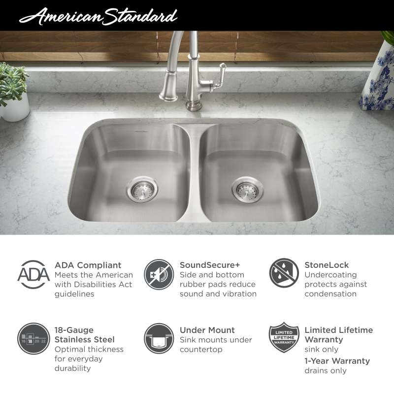 A perfect blend of classic style and modern functionality, the Portsmouth Single-Bowl Undermount Stainless Steel Kitchen Sink from American Standard coordinates seamlessly with every kitchen. This ADA compliant sink is 6” deep for easy accessibility and features bottom and side sound pads for reduced noise and vibration. Multilayer spray insulation ensures optimal protection against scratches, heat, and condensation. Made of durable 18-gauge stainless steel, it pairs perfectly with the Portsmouth Kitchen Faucets.
