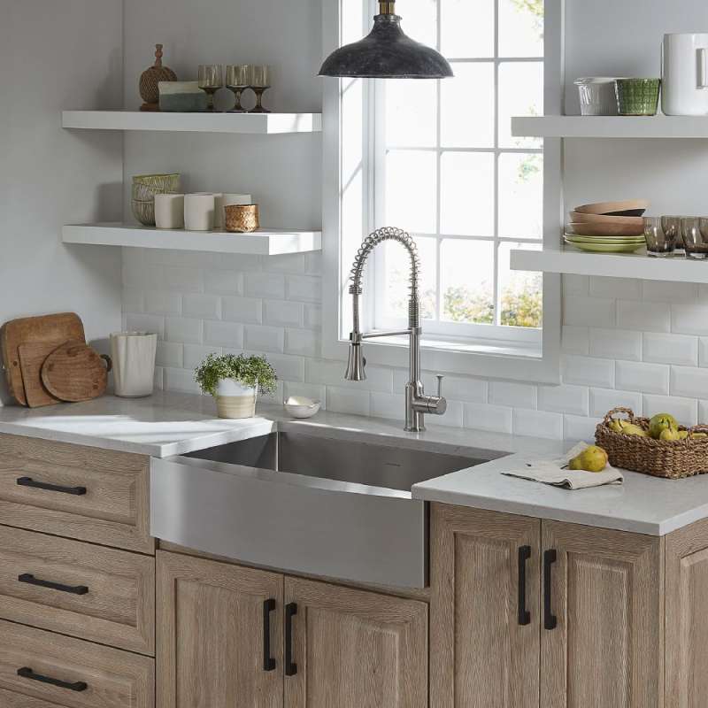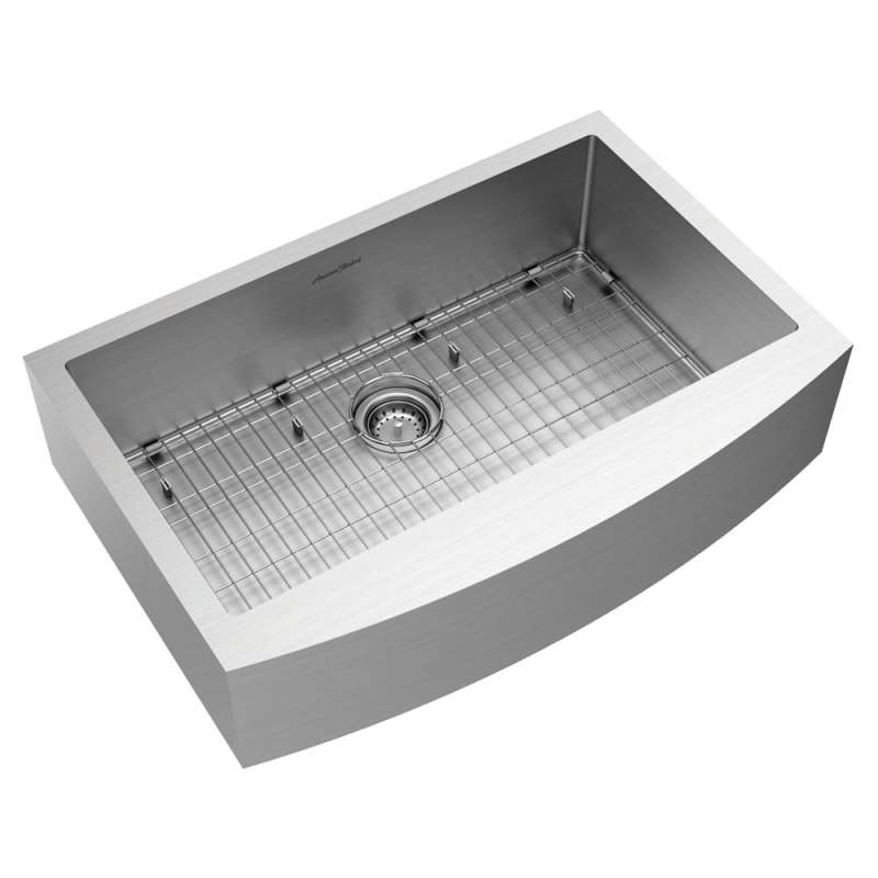 A transitional twist on classic farmhouse design, Pekoe Apron Front Sinks provide a large, accessible single bowl for washing everything from small dishes to large pans. These handcrafted sinks feature channel grooves and 10mm rounded corners for easy cleaning. The durable 18-gauge stainless steel finish coordinates with today's appliances and is naturally stain, heat and chip resistant.