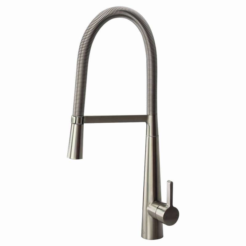 - Faucet constructed of solid brass and features Luxe Stainless finish, flexible steel spring spout with pull-down spray head, 1.8 GPM flow rate, ceramic cartridge