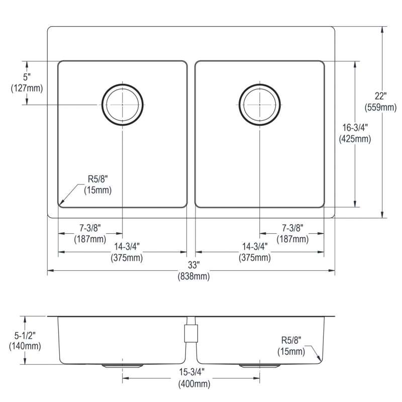 | Countertop Cutout Dimensions | 32-3/8" x 21-3/8" (822mm x 543mm) with 1/2" (12mm) corner radius |