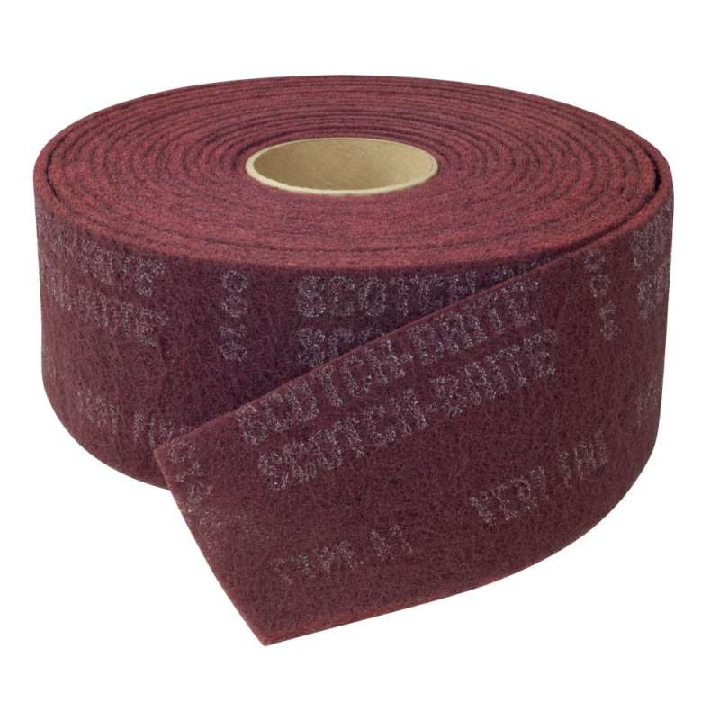 The Scotch-Brite™ Durable Flex Roll is an extremely long lasting non-woven roll durable material used for aggressive deburring, finishing, blending, and cleaning. This roll combines flexibility with effective cutting action to accomplish tough cleaning jobs or produce fine finishing results. It comes in a variety of grades ranging from course to fine. Aluminum Oxide Abrasive This roll uses aluminum oxide abrasive, which is a popular choice among industrial professionals because of its cut-rate and long life. This mineral is a tough, durable abrasive that self-fractures to expose fresh cutting edges in use, whereas traditional abrasives, such as garnet, quickly wear down with use. Due to its high cut-rate, hardness, strength, and low heat retention, aluminum oxide mineral is widely used in grinding applications in addition to sanding and finishing use. Aluminum oxide is suitable on a wide variety of substrates in both woodworking and metalworking, including ferrous alloys. The Scotch-Brite™ Advantage Scotch-Brite™ abrasives are unique surface conditioning products with abrasives incorporated into non-woven fiber matrix. Combining abrasives and non-woven material creates an abrasive system that delivers consistent results for the life of the product. The open-web material runs cool and is load resistant, which keeps the abrasive minerals cutting at high performance by limiting clogging of the fibers.