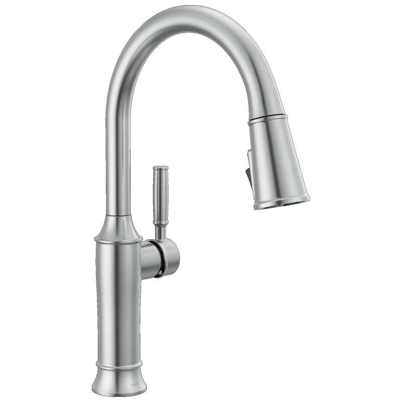 Command your kitchen with the symmetrical, statuesque design of the renaldi collection. The delta proclean kitchen spray provides a powerful, wide fan spray for quick and complete cleaning. Easily clean hard-to-reach places, help remove baked on messes and spray down your sink faster as the wide stream covers more surface area. Lumicoat finishes easily wipe clean without the need for cleaners or chemicals and are guaranteed to resist mineral buildup and hard water stains. The ultra-sleek surface repels liquids, resisting water spots and staying cleaner longer, so your faucet stays beautiful. Magnatite docking uses a powerful integrated magnet to set your pull down sprayer precisely into place and hold it there so it stays docked when not in use. You can install with confidence, knowing that delta kitchen faucets are backed by our lifetime limited warranty.