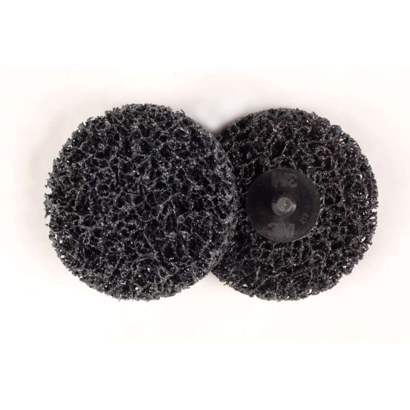 Scotch-Brite™ Roloc™ Coating Removal Disc features extra coarse silicon carbide abrasive to effectively remove paint and rust from metal surfaces and welds. Together with the conformable, non-woven material, silicon carbide abrasives remove coatings without gouging, undercutting, or damaging the base material, especially on hard surfaces. The open-web material runs cool and resists loading, keeping the abrasives actively cutting for consistent results over the life of the product. The Scotch-Brite™ Roloc™ Coating Removal Disc provides more surface area than wire brushes. It is also safer as there are no wires to fly loose and the hook and loop backing holds the disc securely in place during use. The 3M™ Roloc™ TR quick attachment and removal feature also provides fast and easy disc change-out when performing multi-step finishing processes. Scotch-Brite™ Roloc™ Coating Removal Disc uses silicon carbide abrasive. Silicon carbide is a synthetic mineral that is very sharp and commonly used for low-pressure applications such as paint prep. While it breaks down faster than aluminum oxide, it produces a superior finish. Scotch-Brite™ industrial abrasives are a unique surface conditioning product with abrasives incorporated into non-woven nylon or other synthetic fibers. Combining abrasives into the fibers creates an abrasive system that delivers consistent results for the life of the product. The open-web material is load resistant and keeps the abrasive minerals cutting at high performance by limiting clogging of the fibers. 3M™ Roloc™ TR quick change discs are smaller discs that have a plastic threaded button or screw designed to easily and quickly screw onto a 3M™ Roloc™ TR disc pad (sold separately) so that operators can conveniently change discs with a simple twist-off, twist-on motion. The Roloc™ TR system provides a secure attachment even for heavy-duty applications, and the variety of available 3M Roloc discs allows swapping from one application to the next in seconds.