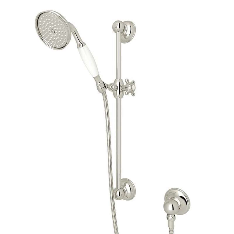 - Complete Package including: x0007_1200 (white resin handle) or 1201 (metal cap handle): Slide bar; x0007_1100/8 (resin handle) or 1101/8 (brass handle): Single-function handshower; 16295: 59" flexible metal hose; 1295: Wall outlet
