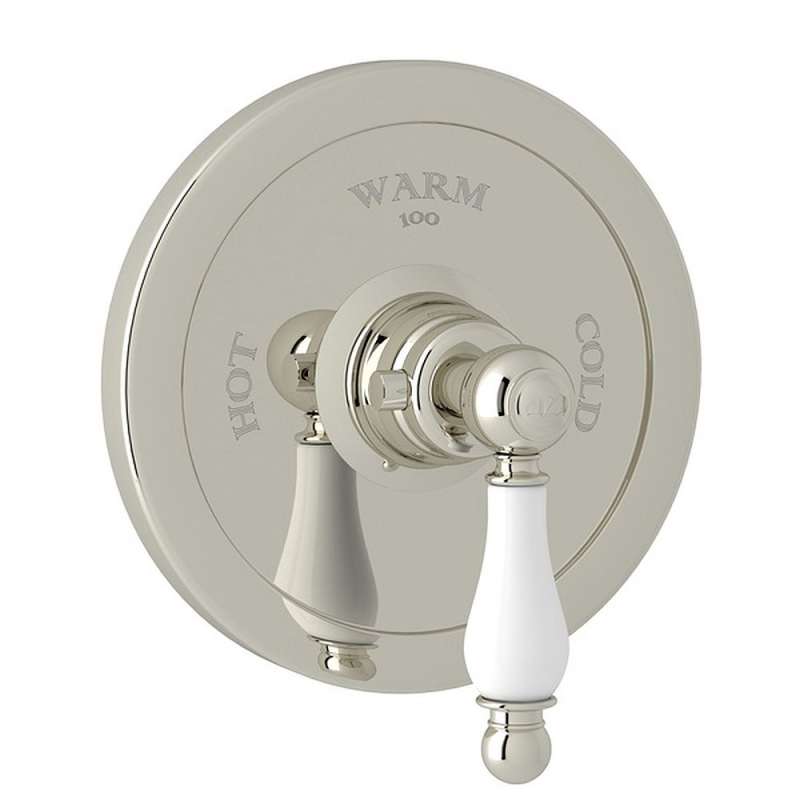 • Thermostatic Trim Plate with Ornate White Porcelain Lever and without Volume Control in Polished Nickel Polished Nickel