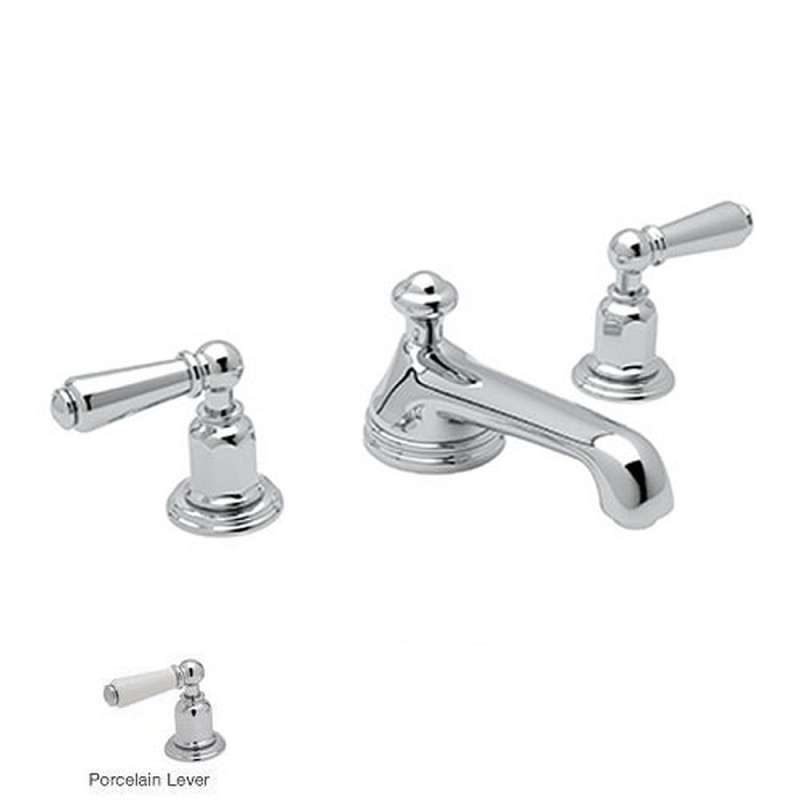 - Perrin and Rowe Low Lead Widespread Bathroom Faucet with Metal Lever Handles and Pop-Up Drain
