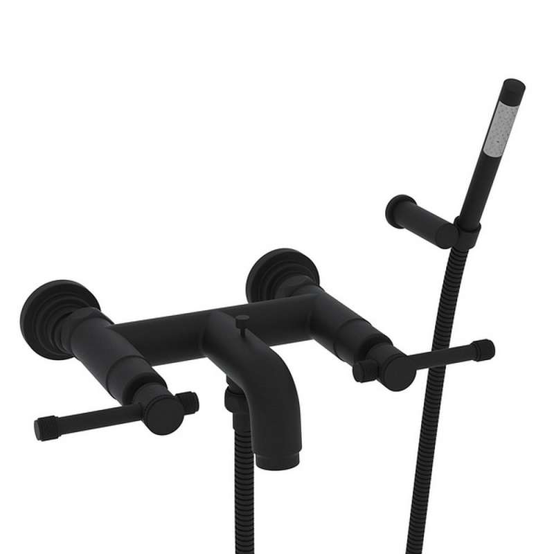 - Wall mount exposed two handle tub filler with handshower holder bracket and single-function ABS handshower