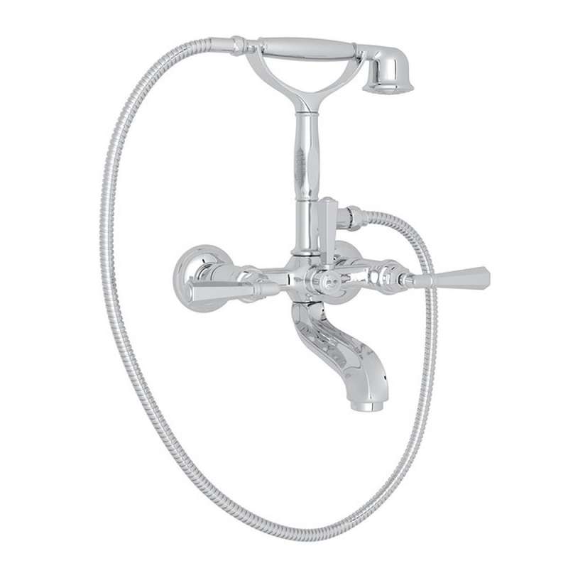 - Wall mounted exposed two handle tub filler with cradle and single-function brass handshower with metal insert