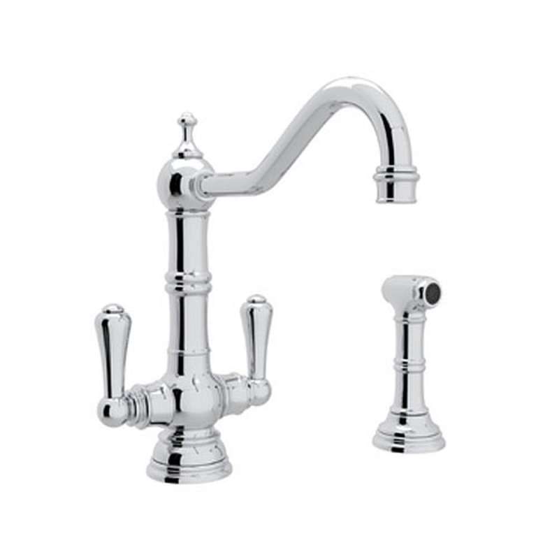 Perrin and Rowe Low Lead Kitchen Faucet with Side Spray and Metal Lever HandlesRohl's Perrin and Rowe collection provides the opportunity to showcase the Victorian theme throughout the home. Design elements like ample scrolling and generously arced spouts define the Victorian theme, augmented by solid brass construction and a wide variety of finish options. Rohl's Perrin and Rowe collection features stylish and high-quality faucets for the kitchen and bathroom, allowing you to carry the theme from room to room. All brass faucet body construction - weight: 11 lbs.