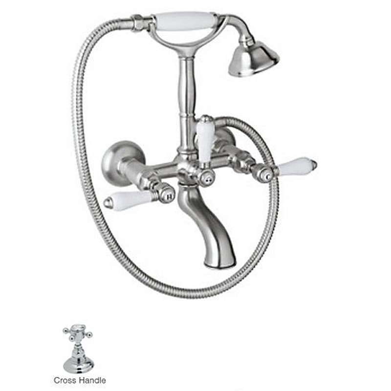 - Country Bath Wall Mount Exposed Tub Filler Faucet with Hand Shower, Hose, and Metal Cross Handles