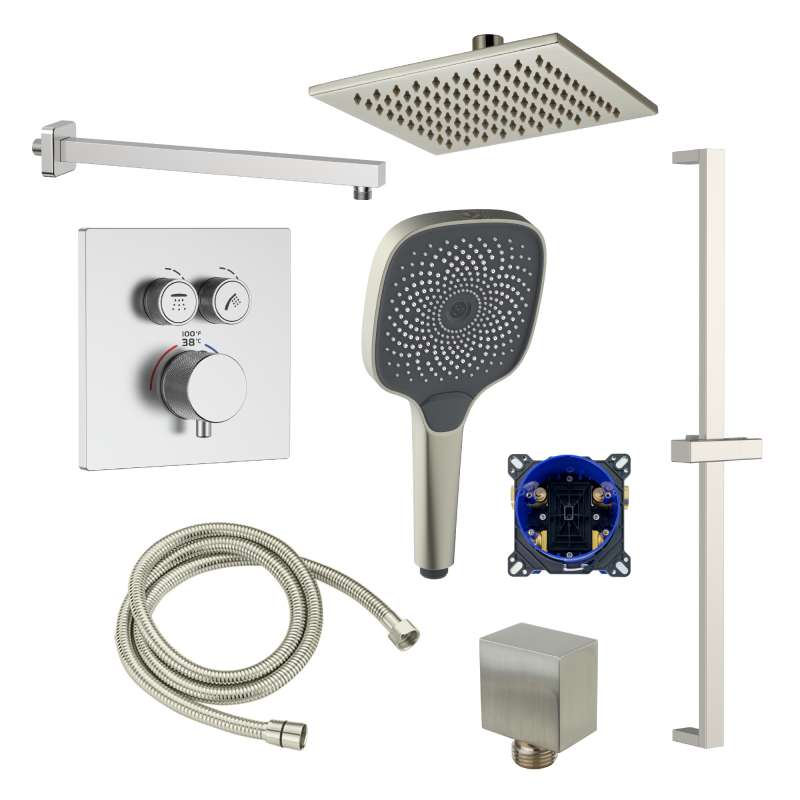 - Kit includes: (1) 12-in showerhead, (1) 16-in shower arm, (1) two function thermostatic valve and trim, (1) Forever Box, (1) 5-in hand shower, (1) 36-in sliding bar, (1) 59-in shower hose, and (1) wall elbow