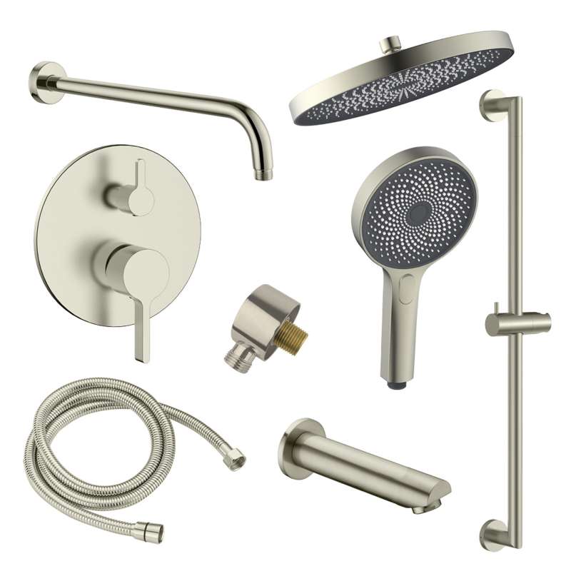 - Kit includes: (1) 10-in showerhead, (1) 16-in shower arm, (1) three function pressure balance valve and trim, (1) 5-in hand shower, (1) 30-in sliding bar, (1) 59-in shower hose, (1) wall elbow, and (1) 6-in tub spout