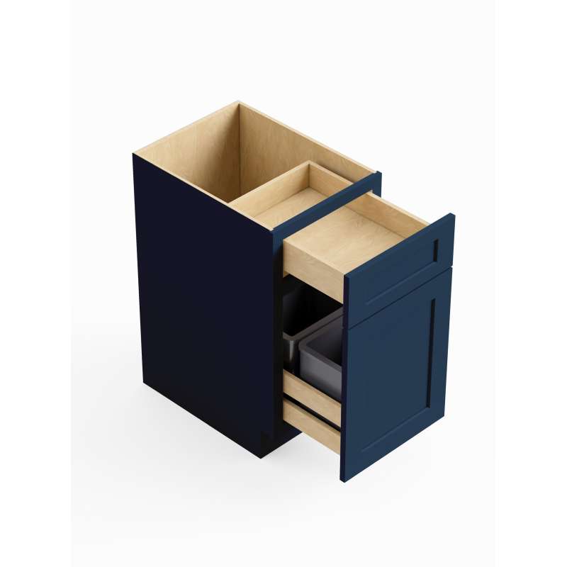 - Framed trash can base cabinet with (1) door, (1) drawer, and (2) trash bins