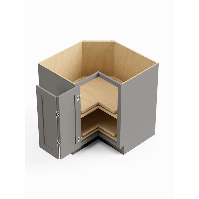 - Framed Lazy Susan easy reach base cabinet with (1) bifold door, (1) full depth shelf, and (2) Lazy Susan trays