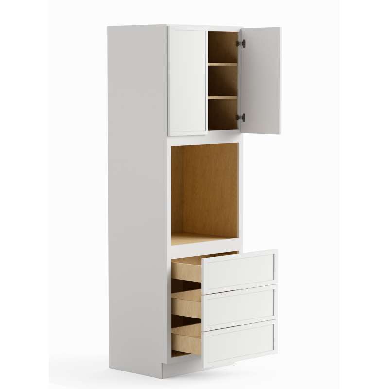 - Framed tall oven cabinet with (2) doors, (3) drawers, and (2) full depth shelves