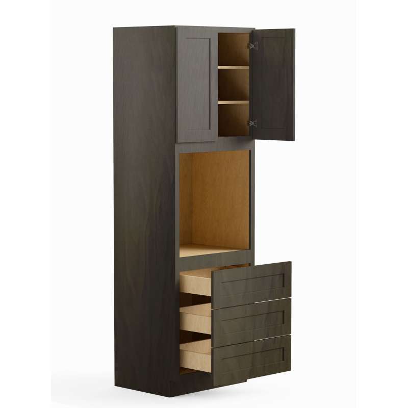 - Framed tall oven cabinet with (2) doors, (3) drawers, and (2) full depth shelves