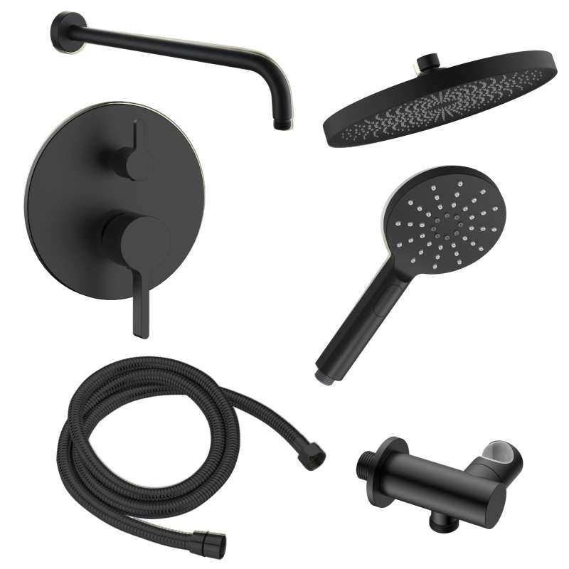 - Kit includes: (1) 9-in showerhead, (1) 12-in shower arm, (1) two function pressure balance valve and trim, (1) 5-in hand shower, (1) 59-in shower hose, and (1) wall elbow
