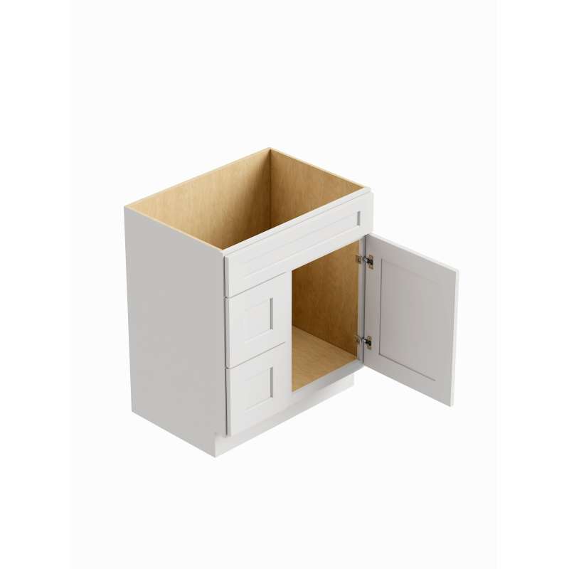 - Framed vanity combo base cabinet with (1) door, (2) drawers, and (1) drawer front; drawers are stacked on the left while door is on the right; drawer front located above door and drawers