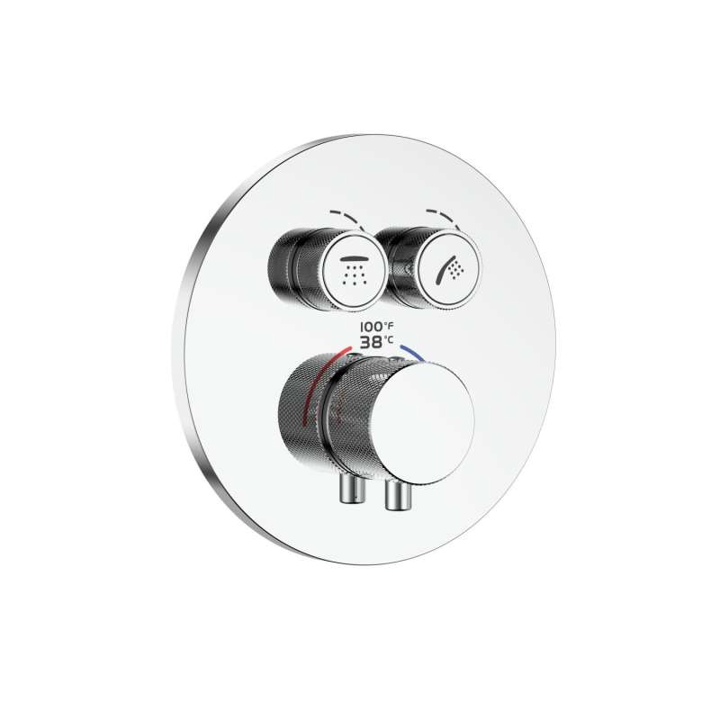 - Round style stainless steel trim plate and handle; one handle and two push buttons