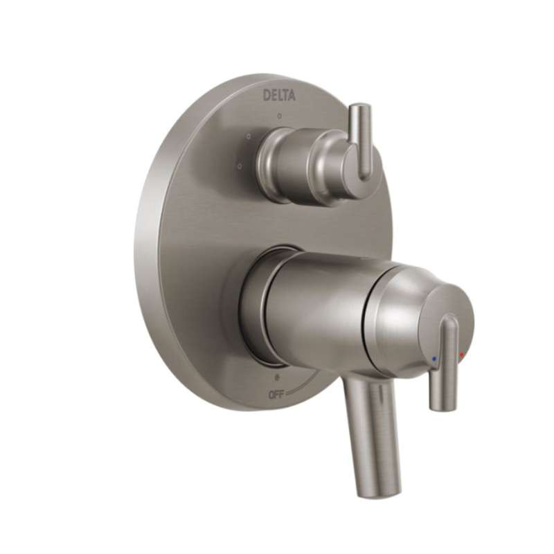 The Delta MultiChoice Integrated Shower Diverter consolidates custom shower design with its consumer-preferred streamlined style eliminating the need for an additional diverter valve. The contemporary round style is a smooth take on modern geometrics, offering a fresh look which can complement a wide range of decor. With three popular style choices to coordinate with any bathroom decor, it provides you the flexibility to select the type of custom shower functionality you prefer. With the MultiChoice Universal system, you have the freedom to upgrade style and functionality later. And, because there's no need to alter plumbing behind the wall, you save time, effort and money on future renovation updates. Delta 's dual-function thermostatic valve cartridge keeps water temperature consistent (within 3.6 degrees) by actually measuring and monitoring the temperature of the water. Temperature can be set in order to remain consistent shower after shower.