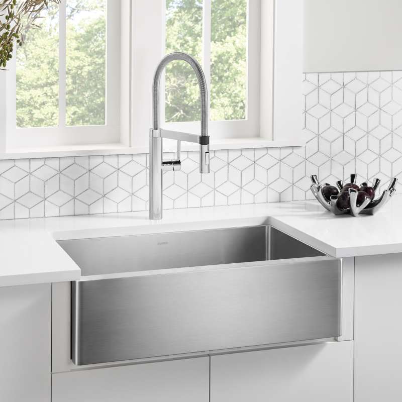 Everyday convenience meets modern design. The QUATRUS R15 Stainless Steel Farmhouse Sink is ideal for busy kitchens thanks to its single bowl configuration that allows for easy washing of pots and pans. German-engineered with corrosion-resistant stainless steel for long-lasting durability and 15 mm radius corners for low-maintenance cleaning -the QUATRUS R15 apron front sink makes kitchen life easy. Combine the QUATRUS R15 kitchen sink with a BLANCO faucet and accessories to create a BLANCO UNIT; a seamless, fully-integrated kitchen solution designed to transform kitchen chores into joyful experiences. Everything you need to drink, prep and clean, all in one place.