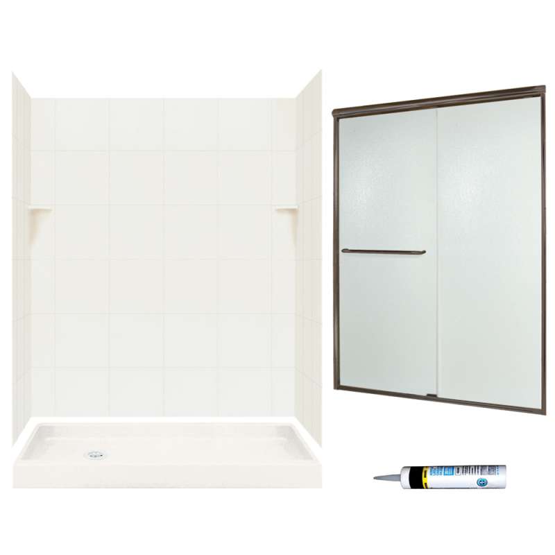 - Kit includes shower door, 2 side panels, back wall panel, 2 corner soap dishes, shower base, and drain cover