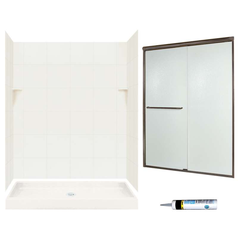 - Kit includes shower door, 2 side panels, back wall panel, 2 corner soap dishes, shower base, and drain cover
