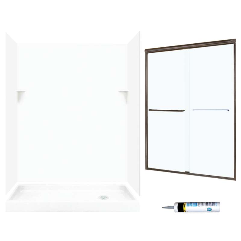 - Kit includes shower door, 2 side panels, back wall panel, 2 corner molding strips, 2 corner soap dishes, shower base, and drain cover