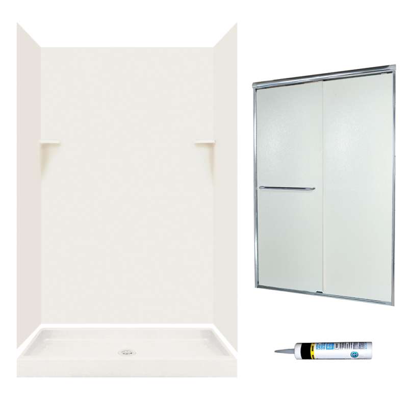 | Component(s) Included | Shower door, 2 side panels, back wall panel, 2 corner molding strips, 2 corner soap dishes, shower base, drain cover |