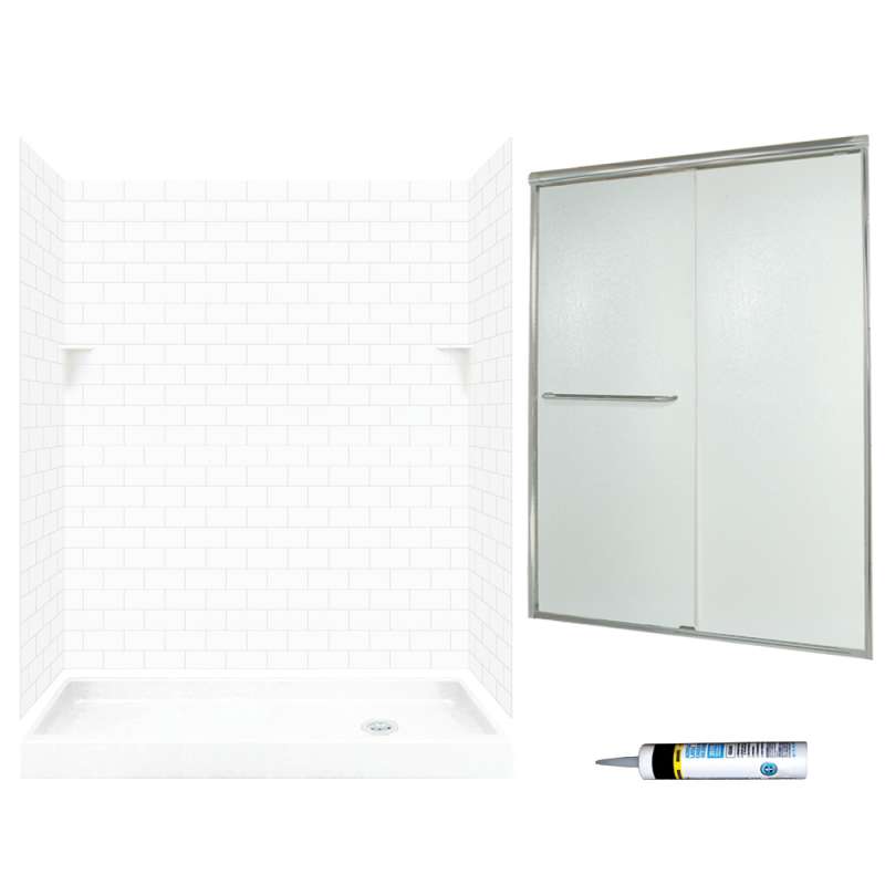 - Kit includes shower door, 2 side panels, back wall panel, 2 corner soap dishes, shower base, and drain cover