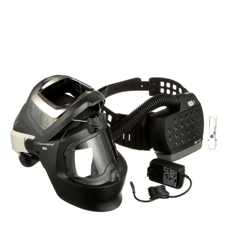 The 3M™ Adflo™ Powered Air Purifying Respirator System with 3M™ Speedglas™ 9100 MP Welding Helmet is designed to help protect the eyes and face from radiation, sparks, and spatter. This system also includes respiratory protection, head protection, optional hearing protection, and a flip-up welding shield. The 3M™ Adflo™ Powered Air Purifying Respirator (PAPR) and 3M™ Speedglas™ Welding Helmet 9100 MP with auto-darkening filter (ADF) offers the welder compact, lightweight respiratory protection and quality filter optics all-in-one. (ADF sold separately.)The 3M Adflo PAPR features a lithium ion battery, high efficiency particulate filter, and wide leather belt. Audible and visual alarms signal low airflow and low battery charge. The high efficiency particulate filter can be "stacked" onto an optional 3M™ Adflo™ Cartridge (not included) for additional protection against OV/SD/CL/HC vapors.The 9100 MP welding helmet features:• Flip-up assembly for grinding and prep work• Side windows -Shade 5 side filters that increase peripheral vision• Ergonomic, adjustable head suspension for increased comfort, helmet stability and weight distribution• Auto-Darkening Filter not included -Compatible with 3M™ Speedglas™ Auto-Darkening Filters 9100V / 9100X / 9100XX- Offers Assigned Protection Factor (APF) of 25 when used as a NIOS H-approved system• When used with a compatible 3M™ Speedglas™ Auto-Darkening Filter Series 9100, this is a NIOS H-approved system and meets ANSI Z89.1 -2009 requirements for Type 1 Class G hardhats and meets ANSI Z87.1-2010• Earmuff protection available as optional accessory• Storage bag and welding cap included